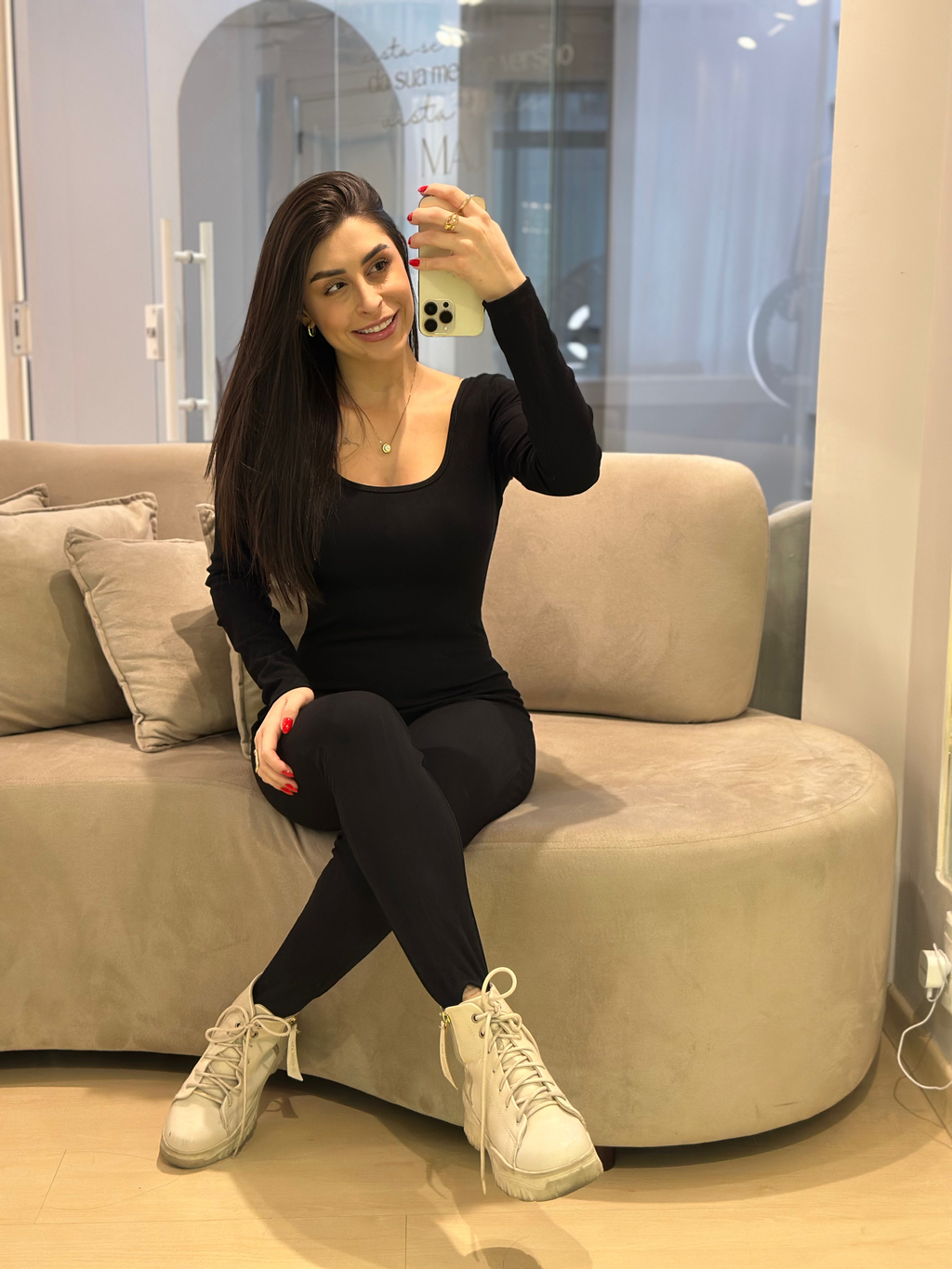 Com manga longa e detalhe do pezinho que protege e aquece, o Macacão Cloe é ideal para os dias mais fresquinhos, proporcionando elegância e funcionalidade em uma única peça. A cor preta confere versatilidade, facilitando combinações para diversas ocasiões.